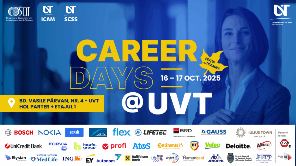 Avem onoarea de a vă invita să participați la o nouă ediție din seria evenimentelor de networking devenite importante pentru parcursul profesional al studenților și absolvenților UVT, desfășurată sub genericul „Career Days @UVT”, organizată în zilele de 16 și 17 octombrie 2025 (cu desfășurare în spațiile centrale din sediul principal UVT, V.Pârvan nr 4). Evenimentul de networking va fi deschis joi, 16 octombrie, începând de la ora 9.45, cu participarea conducerii UVT, a rectorului UVT, Marilen Gabriel Pirtea, a prorectorilor și reprezentanților din echipele de conducere ale celor douăsprezece facultăți din UVT, alături de care se vor afla reprezentanți ai companiilor angajatoare.