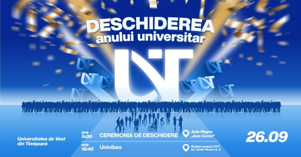 Universitatea de Vest din Timișoara (UVT) vă invită să participați la Ceremonia deschiderii noului an universitar 2025-2026, o festivitate specială ce va fi organizată vineri, 26 septembrie, începând de la ora 9 (în Aula Magna „Ioan Curea” a UVT), unde sunt așteptați să participe studenții, familiile și apropiații lor, dar și universitarii, cercetătorii și personalitățile din comunitate invitate la UVT, o sărbătoare ce marchează debutul activităților academice din noul an universitar.