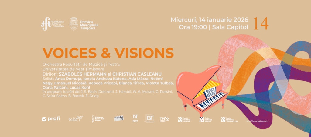 Avem bucuria de a vă invita să participați la Concertul „Voices & Visions”, un eveniment oferit comunității timișoerene de Orchestra Facultății de Muzică și Teatru din cadrul Universității de Vest din Timișoara (UVT), dirijori Szabolcs Hermann și Christian Câșleanu. Concertul va avea loc miercuri, 14 ianuarie 2026, la Sala „Capitol” a Filarmonicii Banatul, începând de la ora 19.