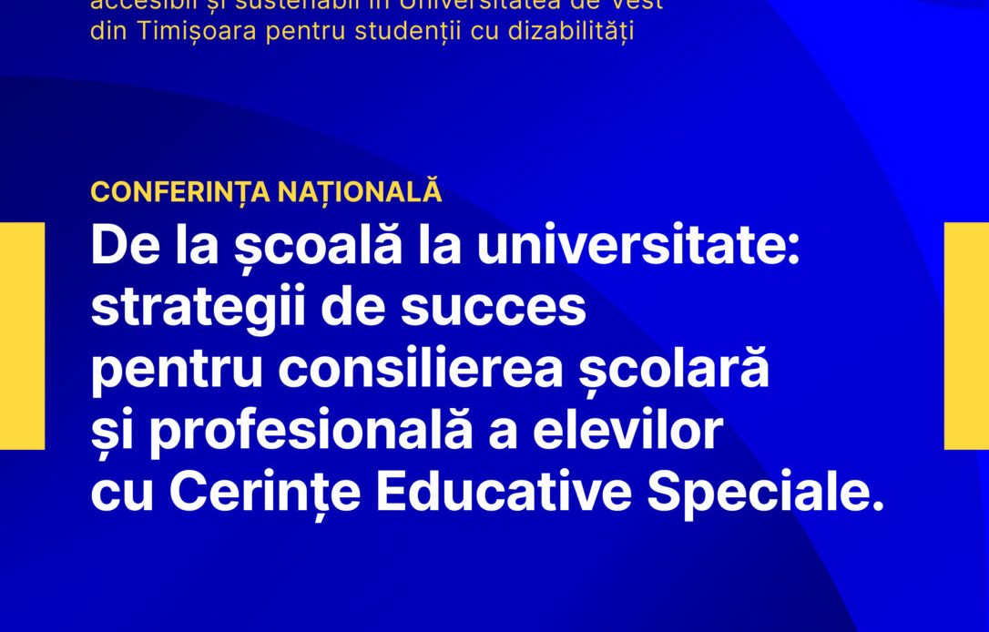 În data de 3 decembrie 2025, Universitatea de Vest din Timișoara (UVT), prin Facultatea de Psihologie și Științe ale Educației, Departamentul de Științe ale Educației, în parteneriat cu Centrul Județean de Resurse și Asistență Educațională Timiș (CJRAE), a organizat Conferința Națională „De la școală la universitate: strategii de succes pentru consilierea școlară și profesională a elevilor cu Cerințe Educative Speciale”.
