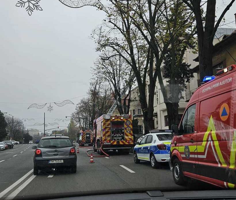 ”În jurul orei 11:55, am fost solicitaţi să intervenim la o degajare de fum din acoperişul unui imobil (parter + 3 etaje) de pe Splaiul Tudor Vladimirescu din Timişoara. La faţa locului s-au deplasat de urgenţă 11 pompieri cu 2 autospeciale de stingere şi o autospecială de lucru la înălţime. La sosirea echipajelor la locul intervenţiei, incendiul se manifesta într-o încăpere tehnică (aproximativ 30 mp), situată la ultimul nivel al imobilului”, a transmis ISU Timiş.