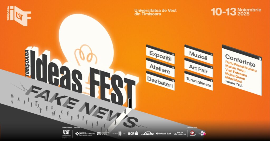 În perioada 10–13 noiembrie 2025, „Timișoara Ideas Fest” oferă un spațiu de întâlnire pentru studenți, cercetători, jurnaliști, creatori de conținut, profesori și tineri, într-o serie de evenimente care explorează mecanismele manipulării, impactul propagandei în societate și felul în care mediul digital ne modelează percepția asupra realității. Tema primei ediții este „Fake News”, un subiect de maximă actualitate astăzi, un timp în care informația circulă cu o viteză uluitoare iar granițele dintre adevăr și percepție devin fluide.