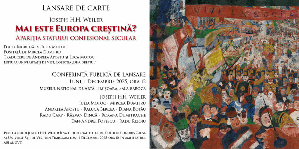 Imediat după ceremonie, va avea loc conferința de lansare a traducerii în limba română a cărții Profesorului Joseph H.H. Weiler, Mai este Europa creștină? Apariția statului confesional secular, publicată la Editura Universității de Vest, în Colecția „De-a dreptul”, o ediție îngrijită de doamna Profesor Iulia Motoc și a cărei postfață este semnată de domnul Academician Mircea Dumitru, Vicepreședintele Academiei Române. Conferința va fi găzduită de Sala Barocă a Muzeului Național de Artă Timișoara (Piața Unirii nr. 1), începând de la ora 12, și va reuni, alături de autor și profesorii menționați, implicați în editarea cărții, o serie de intervenienți din universități și institute de cercetare din București, Cluj-Napoca și Timișoara – în ordine alfabetică: Andreea Apostu, Raluca Bercea, Diana Botău, Radu Carp, Răzvan Dincă, Roxana Dumitrache, Dan-Andrei Popescu, Radu Rizoiu.